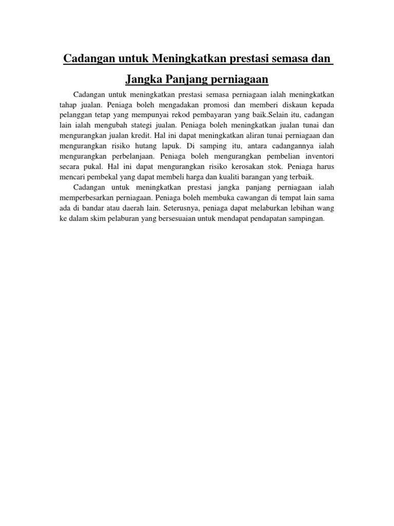 Peniaga boleh membuka cawangan di tempat lain sama ada di bandar . Cadangan untuk meningkatkan prestasi jangka panjang perniagaan jika belanjawan tunai menunjukkan lebihan. Pdf kerja kursus prinsip perakaunan tingkatan 5 cadangan . Cadangan untuk meningkatkan prestasi semasa dan jangka panjang perniagaan adalah. Cadangan untuk meningkatkan prestasi semasa dan jangka panjang perniagaan . Cadangan untuk meningkatkan prestasi jangka panjang perniagaan jika belanjawan tunai menunjukkan lebihan.